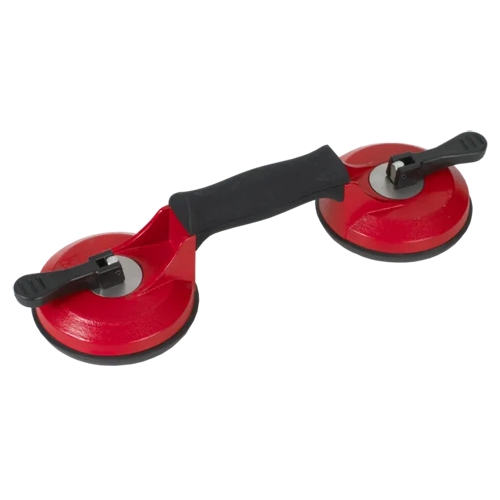 La ventosa doble, de RUBI, dispone de un chasis, de alta resistencia, fabricado en aluminio y un mango ergonómico para incrementar la comodidad durante la manipulación de piezas pesadas. Con una carga máxima de 80 kg , la ventosa doble de RUBI es perfecta para la manipulación de baldosas cerámicas de formatos extra-grandes o de paneles de vidrio u otro elemento.